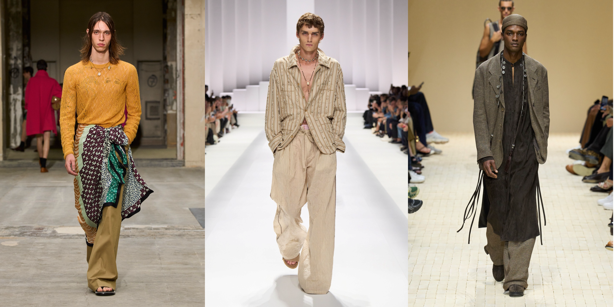 The boho aesthetic is another early-2000s revival showing up across menswear collections. While it may not fully dominate the mainstream, it’s set to become highly visible during festival season and summer. Designers like Emporio Armani, Dries Van Noten, Ziggy Chen, and Dolce & Gabbana have all explored variations of the look, flowing silhouettes, stripes, and earthy textures.