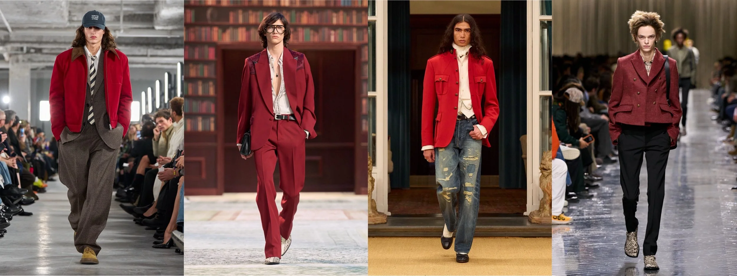 Red was everywhere, but rarely aggressive. Designers explored deep crimsons, bordeaux, spice reds and muted cherry tones, often against neutral backdrops. Rather than dominating the look, red acted as a visual anchor: confident, emotional, deliberate.